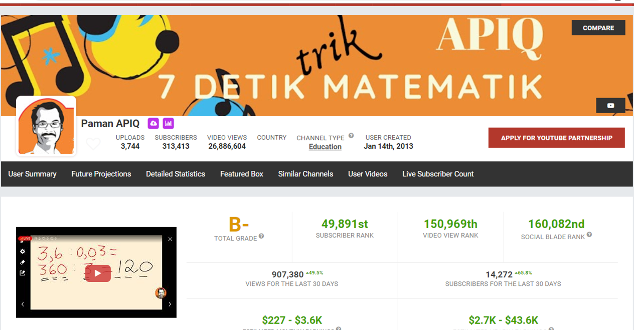 Bagaimana bila penghasilan paman apiq adalah agak ke kanan yaitu 3k dolar per bulan maka menjadi sekitar 40 juta per bulan kali 2 canel menjadi 80 juta per bulan. Nah kalau yang ini besar sekali. Itu hanyalah estimasi dari socialblade.