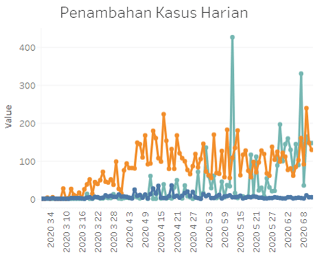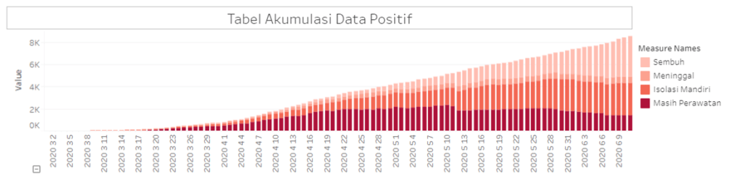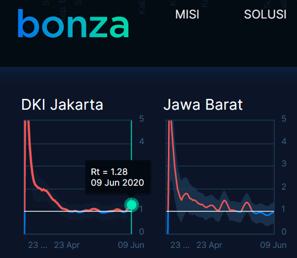 Contoh gambar di atas adalah, hasil estimasi Bonza, pada tanggal 09 Juni 2020 nilai Rt Jakarta = 1.28 yang lebih besar dari 1.