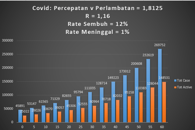 Perilaku masyarakat Indonesia saat ini menghasilkan parameter percepatan P = 1,8125 dan mengakibatkan R = 1,16 konsisten. Maka dalam 60 hari ke depan total kasus aktif (kuning) berkembang mencapai 148 ribuan orang, secara eksponensial.