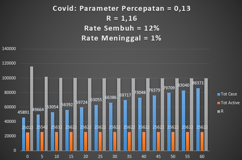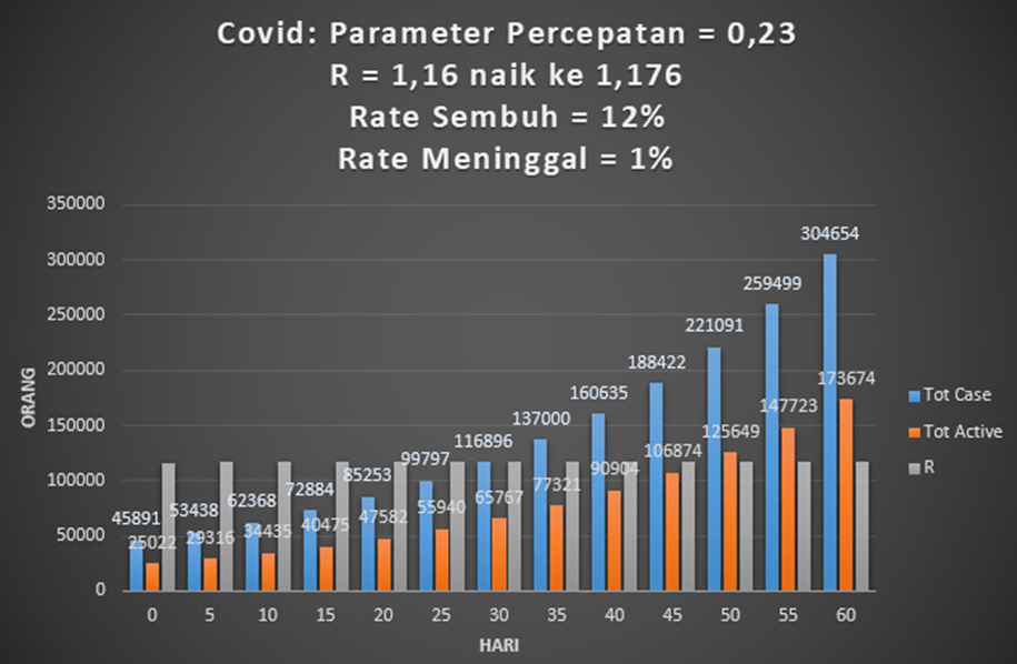 Tetapi grafik di bawah lebih mendekati kondisi Indonesia sebenarnya di mana R sekitar 1,16 dan 1,17. Total aktif menjadi 173 ribu lebih, dalam 60 hari ke depan. Dan total kasus lebih dari 304 ribu orang. Tampaknya kondisi ini terlalu riskan.