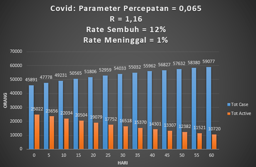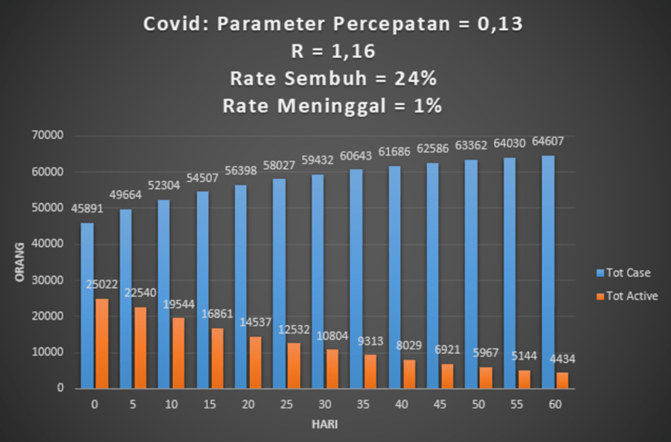 Kita lihat dari grafik di atas, total kasus aktif lebih cepat turun dan hanya tinggal 4 ribuan orang setelah 60 hari ke depan. Tentu R sudah turun di bawah 1 dan pandemi corona mereda di Indonesia.