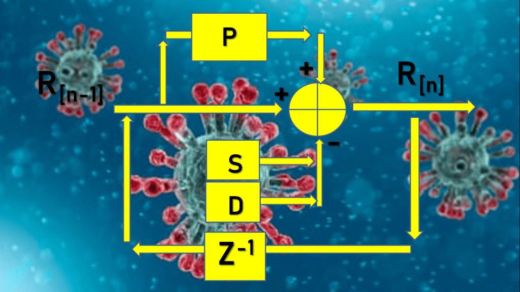 Saya menggunakan model matematika Repcon – Reproduction Number Controlling – untuk membuat analisis di atas. Di mana R dapat kita formulasikan dengan diagram blok berikut.