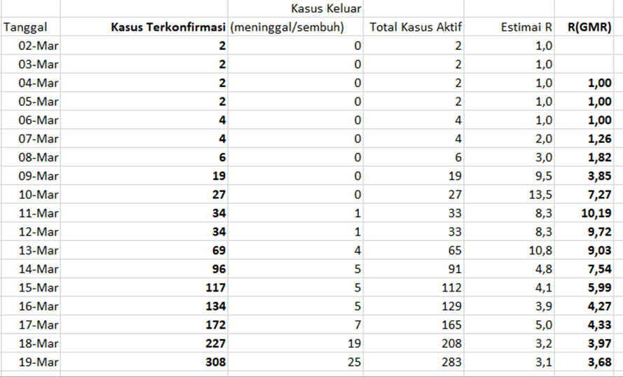 - Hasil estimasi R dengan GMR, meski barangkali berbeda dengan estimasi metode lain, dapat kita gunakan untuk memprediksi pertumbuhan wabah karena hakikatnya menghitung ratio geometri suatu deret.
