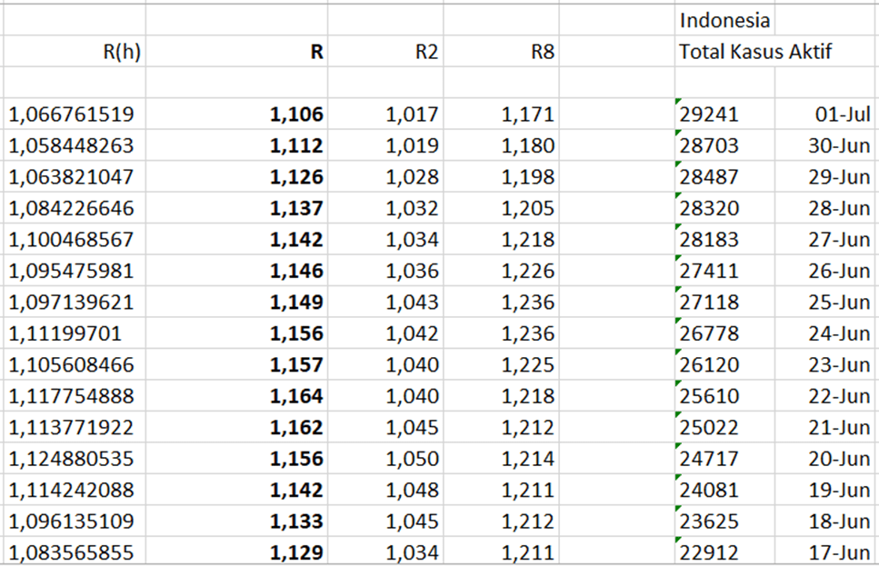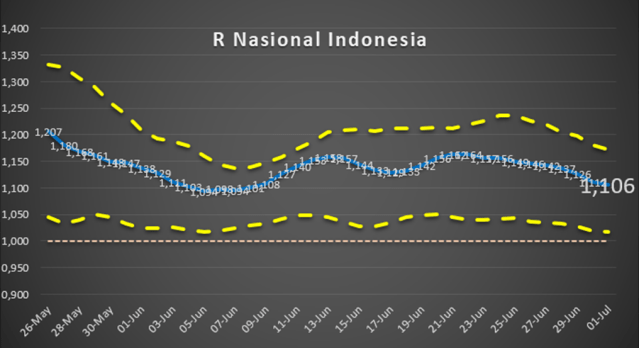 Kita lihat nilai R Indonesia sepanjang bulan Juni 2020 konsisten lebih dari 1. Di mana hal ini menunjukkan bahwa pandemi di Indonesia masih terus berkembang selama bulan Juni.