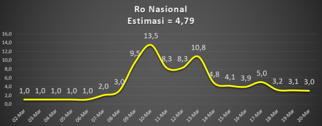 Saya mencoba menghitung Ro Indonesia. Dengan data-data resmi awal Maret 2020 saya hitung nilai R efektif seperti grafik di atas. Lalu saya cari solusi persamaan R puncak. Dan menghasilkan R0 Indonesia sekitar,