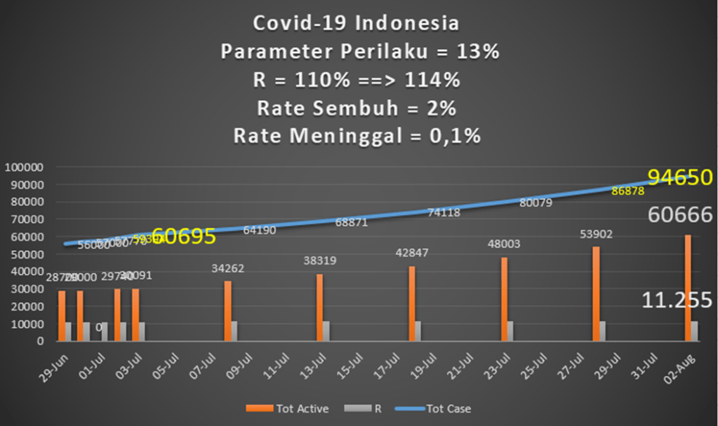 Tapi kondisi lebih buruk bisa terjadi bila parameter perilaku sosial tidak terjaga. Nilai R bisa menanjak jadi 1,14 dengan total kasus mencapai 94 ribuan orang pada awal Agustus 2020. Hal ini dikarenakan parameter perilaku naik jadi P = 13%.