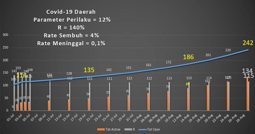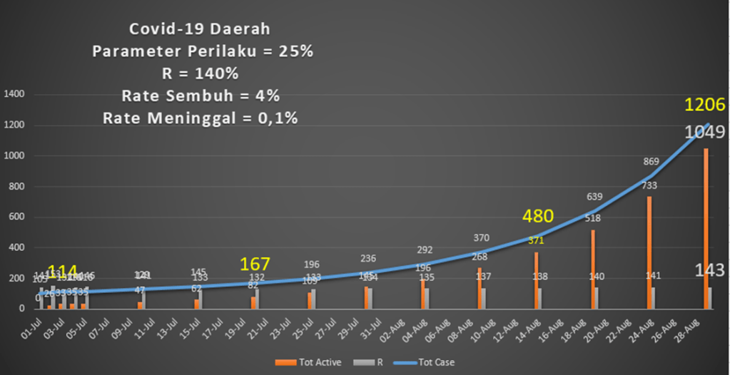 Total kasus menjadi 1206 orang pada akhir Agustus. Dan kasus aktif yang perlu dirawat ada 1049 orang. Nilai R sekitar 1,43. Tentu hal ini perlu dicegah dengan fokus kepada dua hal: manajemen perilaku dan meningkatkan angka kesembuhan.