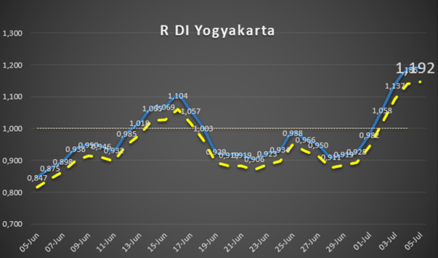 Nilai R Yogyakarta naik turun. Sempat di bawah 1 tapi R kembali naik di atas 1.