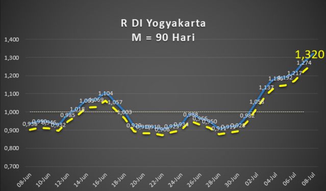 Corona, bagaimana pun, memang dinamis. Awal Juli 2020 kondisi berubah. Nilai R menanjak ke atas 1 dan bahkan 8 Juli 2020, R = 1,32. Lebih besar dari R nasional. Pandemi di Jogja berkembang lagi.