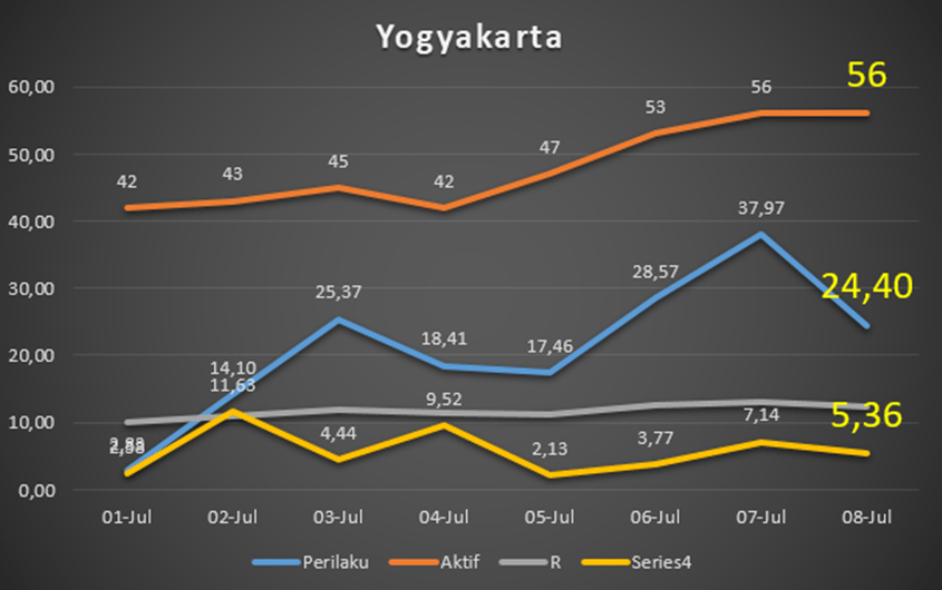Kasus aktif yang semula 42 orang melonjak jadi 56 orang di 8 Juli 2020. Angka kesembuhan termasuk tinggi S = 5,36%. Sayangnya parameter perilaku juga tinggi P = 24,40%.