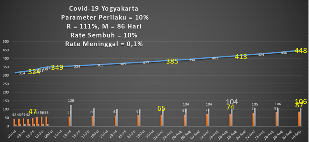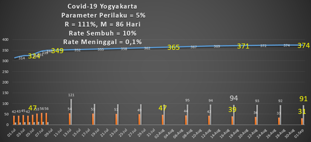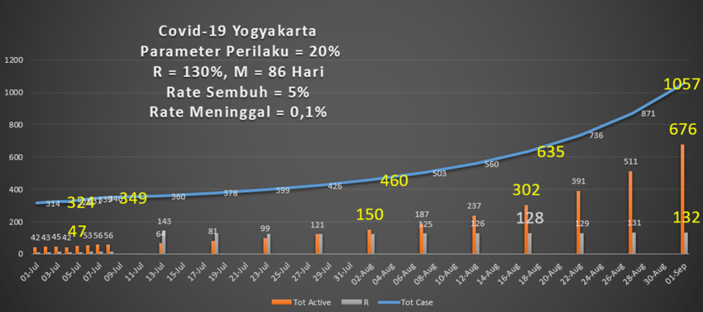 Berhasil. Total kasus aktif tinggal 31 orang di 1 September. Pun nilai R = 0,91 sudah di bawah 1. Maka pandemi segera mereda di Yogya.