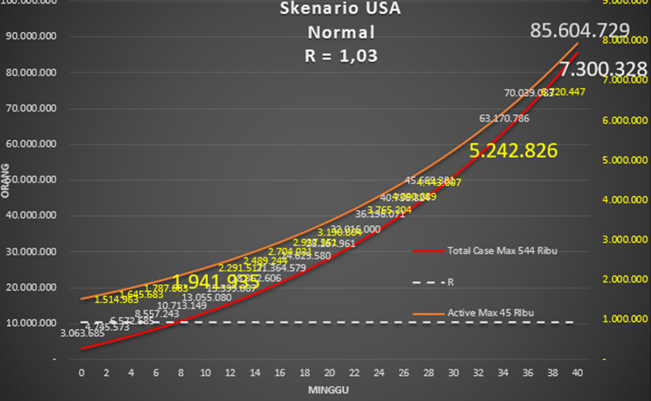 Pertumbuhan kasus di Amerika sekitar R = 1,07 (bisa lebih) adalah cukup besar.
