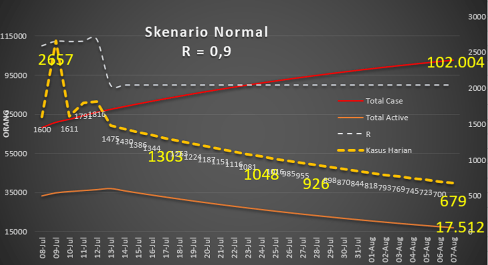 Ketika kita simulasi R = 1,13 bulan Juli – Agustus 2020 grafik menunjukkan cukup linear.
