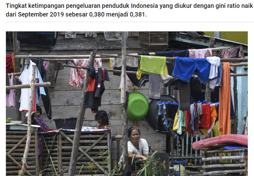 Jelas ada kesenjangan kekayaan di Indonesia. Rasio Gini menunjukkan 0,381 besarnya ketimpangan itu di Maret 2020.