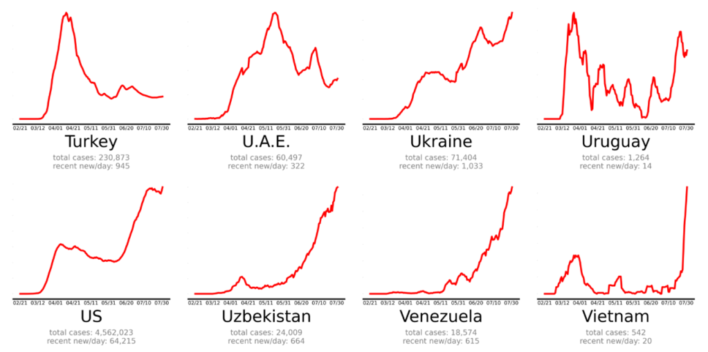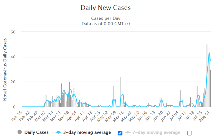 Lonjakan kasus di Vietnam ini jauh lebih besar dari gelombang pertama. Bila di Maret dan Mei lonjakan maksimal 15 kasus dalam 1 hari maka di Agustus ini melonjak lebih dari 40 kasus dalam 1 hari.
