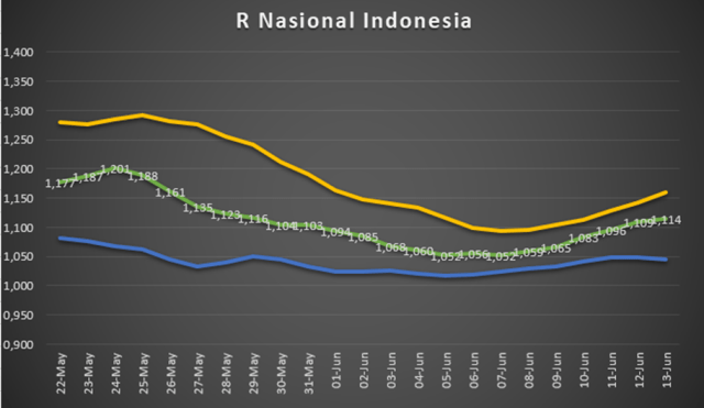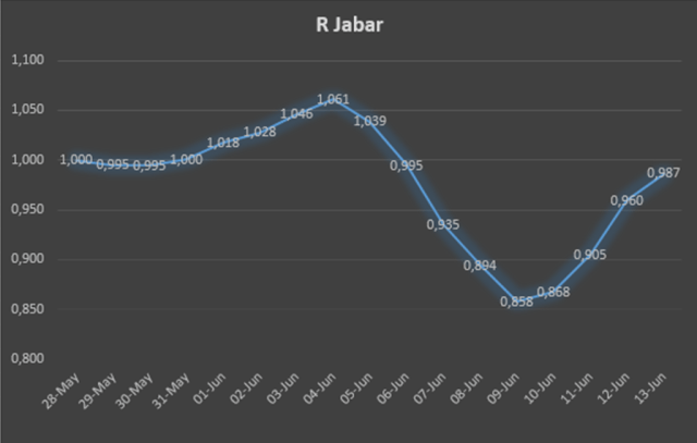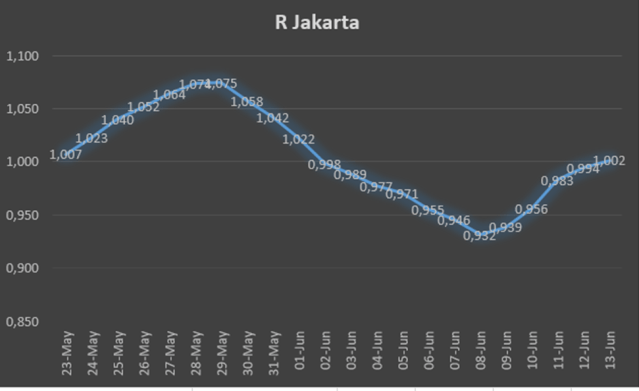 Tetapi Jakarta, pada 13 Juni 2020, kembali menyentuh R = 1,00. Ini akan memperlambat penyelesaian. Sedangkan Jabar juga kembali naik 3 poin meski masih di bawah 1.