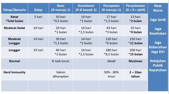Sedangkan kondisi saat ini, saya membaca Indonesia ada dalam skenario normal. Di mana nilai R kadang naik dan kadang turun. Sehingga ada resiko corona tidak pernah berakhir.