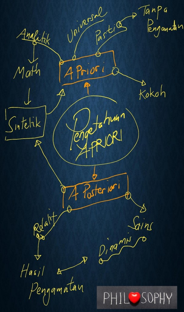 Sehingga jelas perbedaan pengetahuan a priori terhadap a posteriori. Pengetahuan 2 + 1 = 3 adalah pengetahuan a priori, pasti benar.