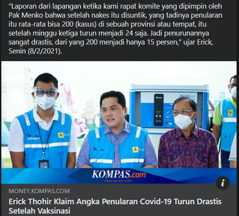 Kabar baik bahwa covid di Indonesia sudah mereda. Bahkan tinggal hanya 15% saja. Demikian laporan dari lapangan yang diklaim menteri BUMN. Kita berharap kondisi Indonesia terus membaik.