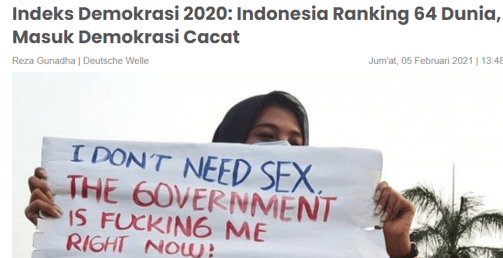 Meski hasil survey terbaru, diumumkan Februari 2021, menyatakan bahwa demokrasi di Indonesia termasuk demokrasi cacat maka itu harus menambah semangat kita untuk memperbaiki. Kita? Kenapa harus kita? Kan mereka yang membuat cacat. Kami hanya rakyat. Di sana banyak pejabat.