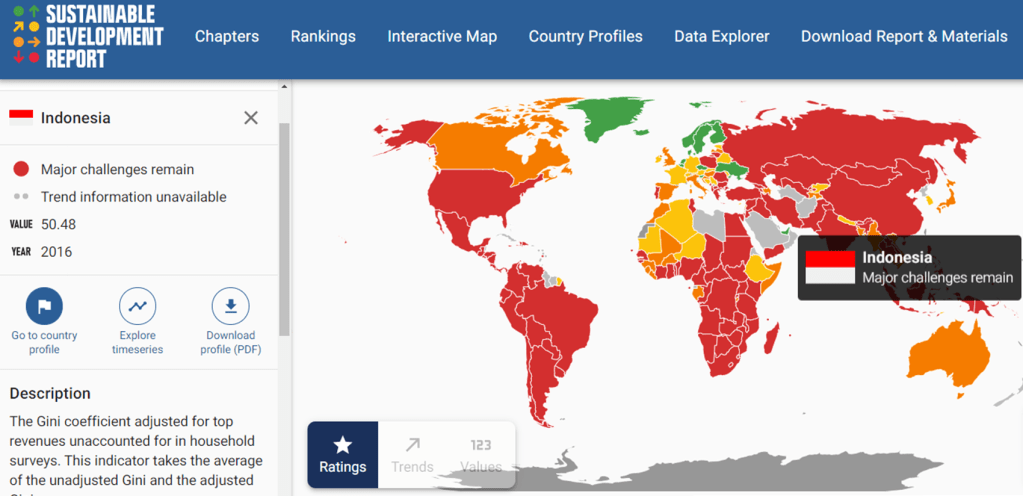 Laporan SDR di atas menunjukkan bahwa peta dunia didominasi warna merah – terdapat masalah besar. Disusul warna kuning dan jingga – terdapat masalah nyata. Dan hanya sedikit yang berwarna hijau – berhasil menekan ketimpangan.