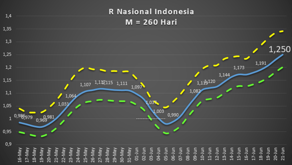 Saya meneliti nilai R, reproduksi, covid-19. Nilai R tidak pernah konsisten di bawah 1. Artinya, virus corona masih terus menyebar dan melonjak. Bahkan nilai R sejak awal Juni sampai akhir Juni 2021 ini terus menanjak. Mencapai R = 1,25 yang sangat tinggi. Waspada.