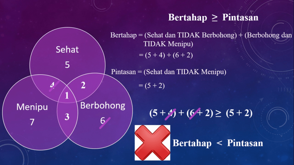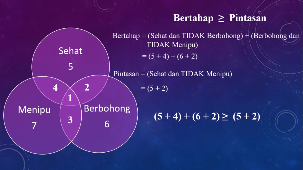Diagram Venn akan memudahkan ilustrasi kita. Kita akan memilih orang yang “sehat” dan tidak “berbohong” dan tidak “menipu”. Dengan pertimbangan wajar, “berbohong” adalah dosa kecil dan “menipu” adalah dosa besar. Jika “berbohong” dilakukan dua kali maka menjadi dosa besar setara dengan “menipu.”