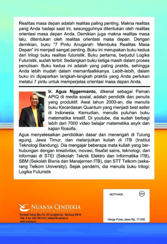 Saya rekomendasikan Anda untuk membaca buku “7 Pintu Anugerah.” Bahkan, saya merekomendasikan setiap orang, tua atau muda, untuk membaca buku “7 Pintu Anugerah.” Mengapa? Karena akan membuka pintu anugerah yang berlimpah berkah untuk kita semua.