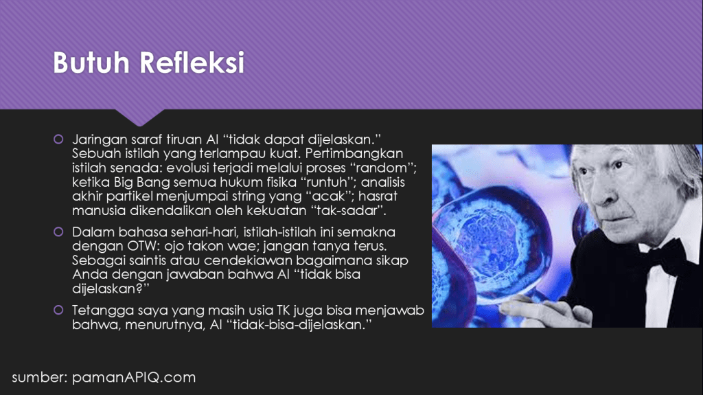 AI (artificial intelligence) sangat cerdas saat ini. Hanya saja, AI tidak mampu refleksi; AI tidak mampu berpikir mendalam sampai sisi ruhani. Hanya manusia, penghuni bumi ini, yang bertugas untuk refleksi. Tetapi, AI sudah mampu deep-learning (belajar mendalam). Apakah suatu saat nanti AI akan mampu refleksi?