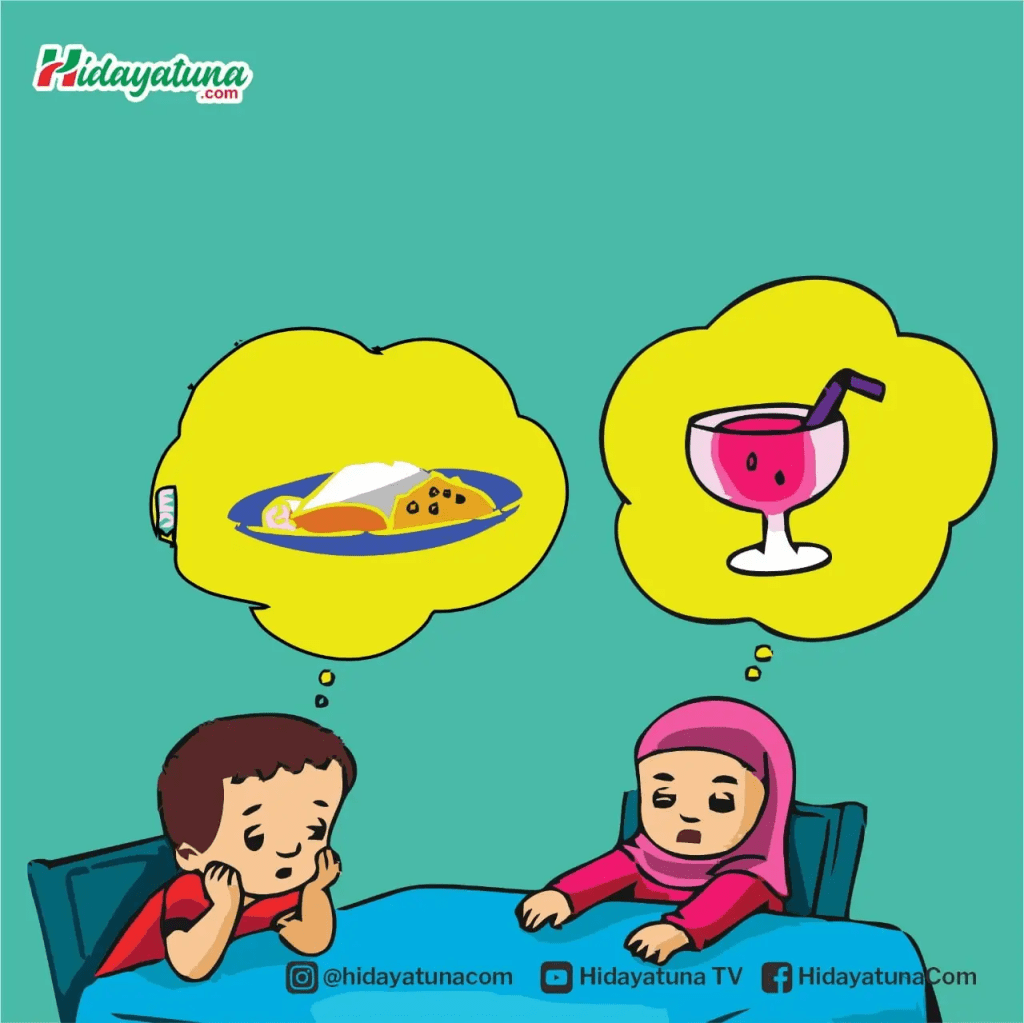 Wija bocah umur 5 tahun latihan puasa dengan susah payah. Jelang maghrib 5 menit lagi, Wija mengeluh, “Aduh lapar banget perutku. Aku gak tahan, aku mau makan.”
