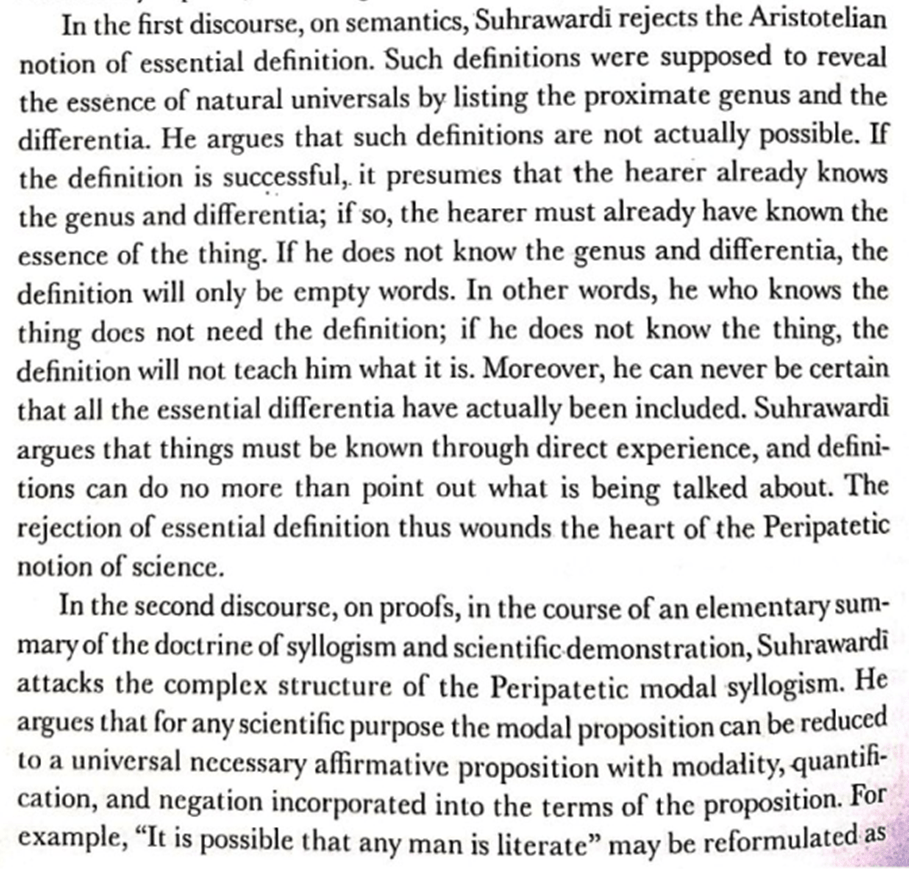 Anggap definisi berhasil mengungkap semua aspek esensial. Untuk memahami definisi maka kita perlu memahami genus dan diferensia tersebut. Orang yang tidak paham genus atau diferensia maka tetap tidak akan paham definisi. Sementara, orang yang sudah paham genus dan diferensia maka tidak perlu definisi tersebut karena memang dia sudah paham. Jadi, definisi esensial gagal untuk menjadi pengetahuan. Suhrawardi mengingatkan bahwa fungsi definisi adalah sekedar menunjukkan. Sedangkan untuk mendapatkan pengetahuan, kita perlu pengalaman langsung, kelak dikenal sebagai ilmu huduri.