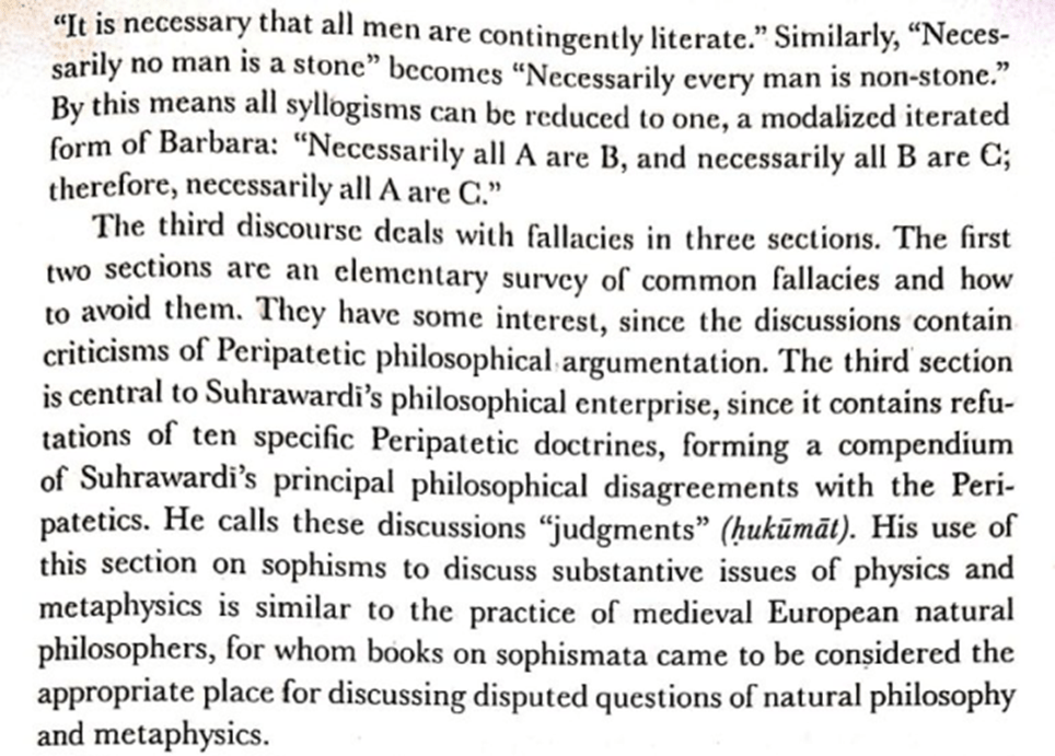 Silogisme universal dari Suhrawardi, kelak, dikenal sebagai bentuk Barbara AAA: (1) niscaya; (2) unviersal; (3) afirmasi. Saya setuju dengan Suhrawardi bahwa kita perlu fokus ke, hanya, satu bentuk logika yang valid. Bentuk logika yang lain, bisa, kita konversi ke AAA.