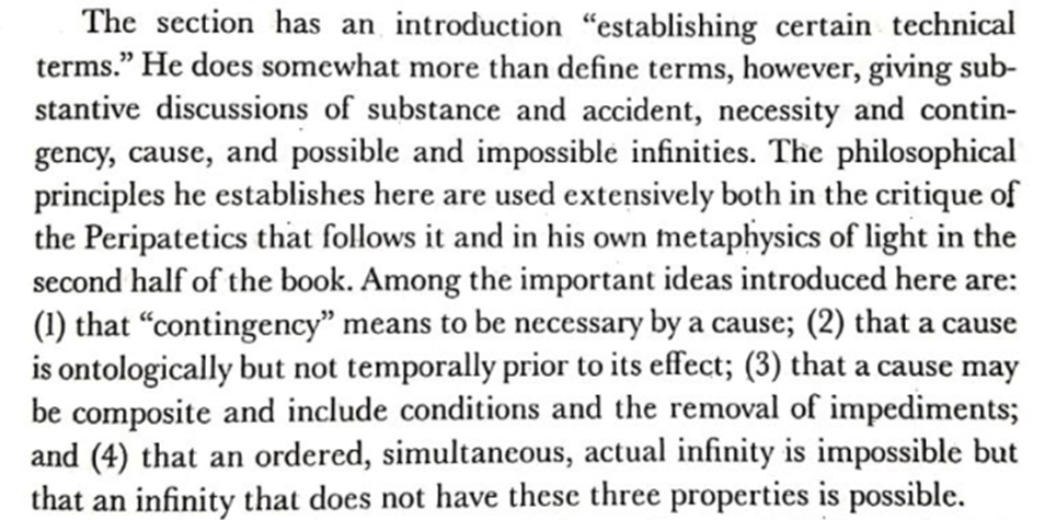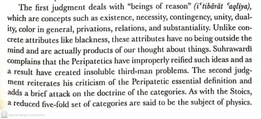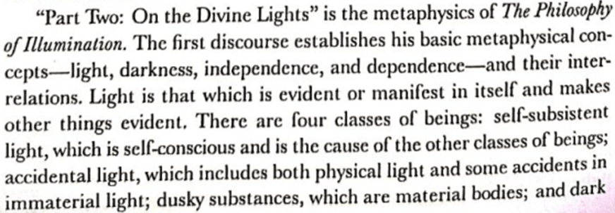 HI menetapkan konsep ontologi penting yang saling berhubungan: cahaya, gelap, mandiri, dan tergantung. Cahaya adalah yang jelas dengan sendirinya. Cahaya menjadikan yang lain lebih jelas. Cahaya terbukti dengan dirinya sendiri. Cahaya menampakkan diri, manifestasi, sebagai cahaya. Terdapat 4 kelas dari being atau wujud: (1) cahaya mandiri yang sadar diri dan menjadi sebab bagi kelas wujud yang lain; (2) cahaya aksidental meliputi beberapa cahaya immaterial yang aksidental dan cahaya fisik; (3) substansi buram yaitu bodi material; (4) gelap aksidental yang meliputi aksiden di dunia materi dan immateri.