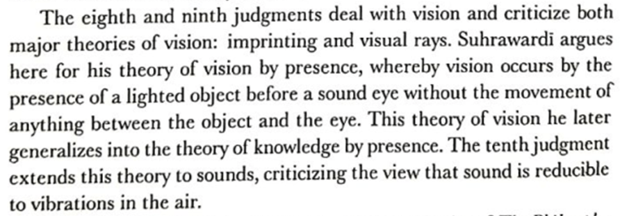 Judgement kesepuluh memperluas huduri untuk kasus pendengaran. Suhrawardi menolak bahwa pendengaran terhadap suara bisa direduksi ke getaran atau gelombang. Pendengaran adalah pengalaman langsung. Kita memang mendengar suara dan kata-kata secara langsung. Bagian 1 diakhiri dengan pertanyaan apa realitas sebenarnya dari bayangan dalam cermin?
