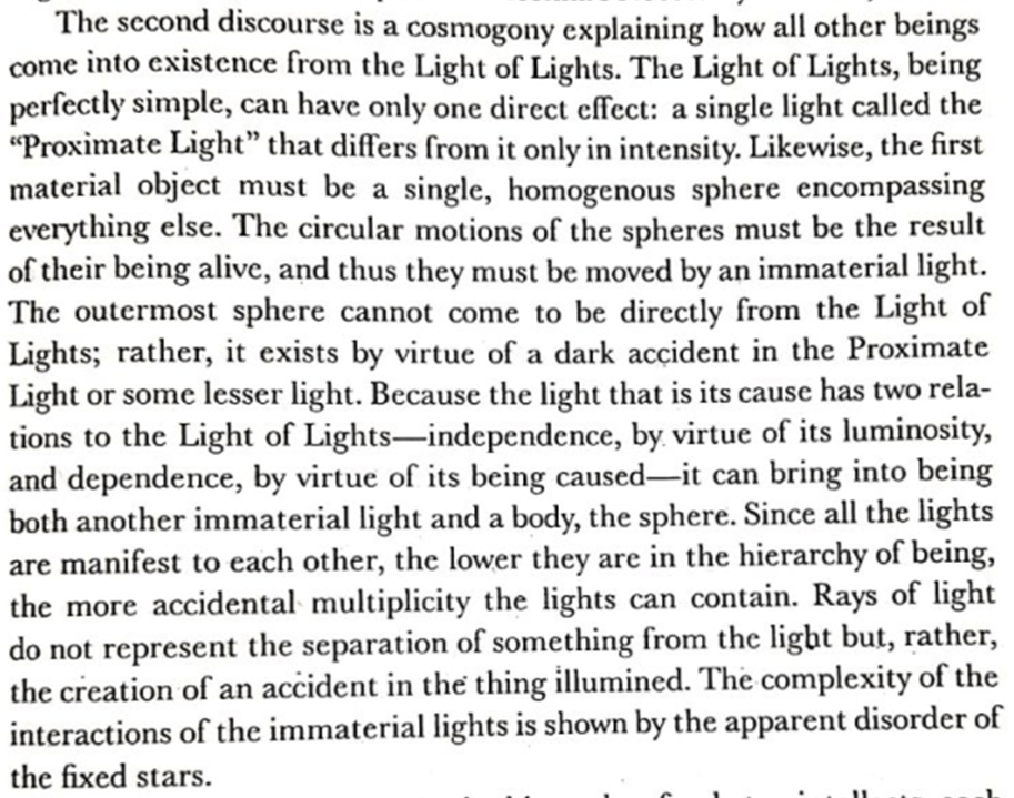 Wacana 2.2 membahas kosmogini menjelaskan bagaimana seluruh eksistensi hadir berkat Cahaya Maha Cahaya. Cahaya Maha Cahaya adalah wujud sederhana sempurna sehingga hanya ada akibat tunggal: “Cahaya Terdekat” atau “Cahaya Pertama”. Cahaya Terdekat ini sama persis dengan Cahaya Maha Cahaya hanya beda sedikit kadar intensitasnya. Demikian halnya, materi pertama harus tunggal sebagai medan segala sesuatu secara homogen. Gerak putaran benda-benda langit tentu saja digerakkan oleh wujud yang hidup. Jadi, benda-benda langit pasti digerakkan oleh cahaya immaterial.