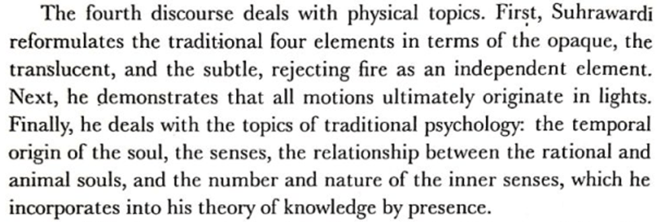 Saya melihat Suhrawardi dengan cermat, dan tepat, menolak api untuk dianggap sebagai unsur. Kita mempertimbangkan maksud unsur adalah materi atau benda maka ada keselarasan opaque = benda padat, translucent = benda cair, dan subtle = benda gas. Sedangkan api adalah kalor atau energi panas. Fisika modern menunjukkan hukum kesetaraan massa energi yaitu formula Einstein E = mc^2. Sehingga benar bahwa energi tidak mandiri terhadap materi. Jadi, Suhrawardi benar bahwa api tidak mandiri dari unsur-unsur lain.