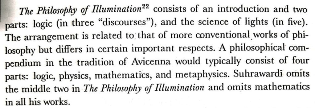 Hikmah Al Isyraq (kita singkat HI) terdiri dari sebuah pendahuluan dan dua bagian: logika (dalam 3 wacana) dan ontologi cahaya (5 wacana). Bandingkan dengan Ibnu Sina, umumnya, terdiri empat bagian: logika, fisika, matematika, dan metafisika. Suhrawardi meninggalkan fisika dan matematika, tetapi membahasnya sekilas dalam logika.