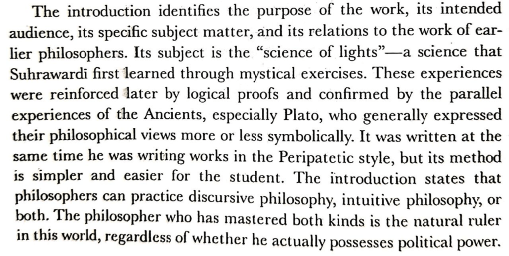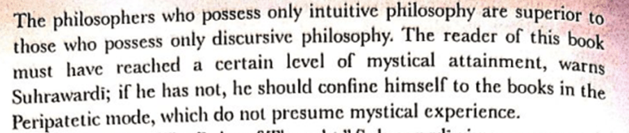 Suhrawardi menulis HI berdasar pengalaman langsung, kemudian, menyusun argumen rasional. Bukan hanya berangkat dari argumen rasional belaka. Akibatnya, HI menerapkan beberapa istilah simbolis sebagaimana Plato. Sampai taraf tertentu, pembaca perlu memiliki pengalaman langsung juga terhadap tema HI. Tanpa pengalaman langsung, HI akan berubah menjadi mode rasional sebagaimana karya Ibnu Sina. Seorang filsuf, pengkaji filosofi, bisa mengkaji filosofi diskursif rasional saja, atau filosofi intuisi langsung saja, atau kedua-duanya. Pengkaji diskursif dan intuisi adalah penguasa alamiah dari dunia ini. Baik mereka penguasa politik formal atau pun tidak.