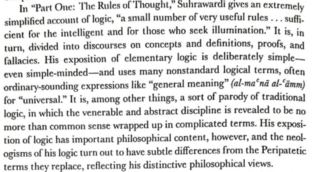 Bahkan, Suhrawardi sering menggunakan makna-umum yang terbebas dari makna teknis logika. Hal ini semacam parodi bagi logika tradisional, yang sejatinya, adalah logika umum hanya diperumit dengan istilah teknis. Bagian logika ini terdiri tiga wacana: (1) konsep dan definisi, (2) bukti, dan (3) falasi. Sebagai hasilnya, HI menghadirkan sistem logika baru yang menyegarkan.