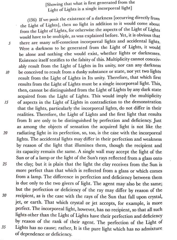 (136) The incorporeal light, however, has no recipient, so that all lights of other than Light of Lights have perfection and deficiency by reason of the rank of their agent.