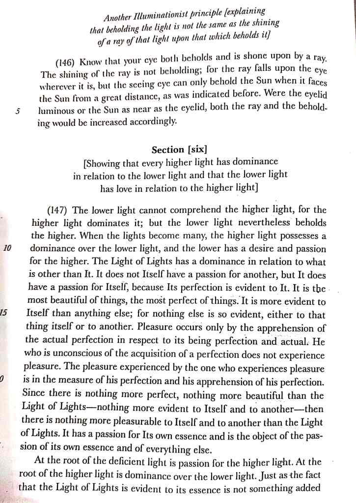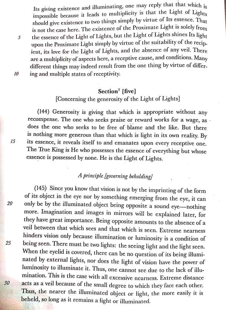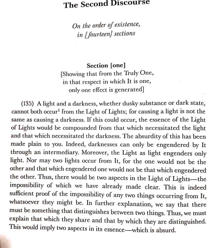 (136) Bagaimana pun, cahaya sejati tidak memiliki penerima. Dengan demikian, semua cahaya, selain Cahaya Maha Cahaya, memiliki kesempurnaan dan kelemahan hanya berdasar derajat penyebab, atau agen, mereka.