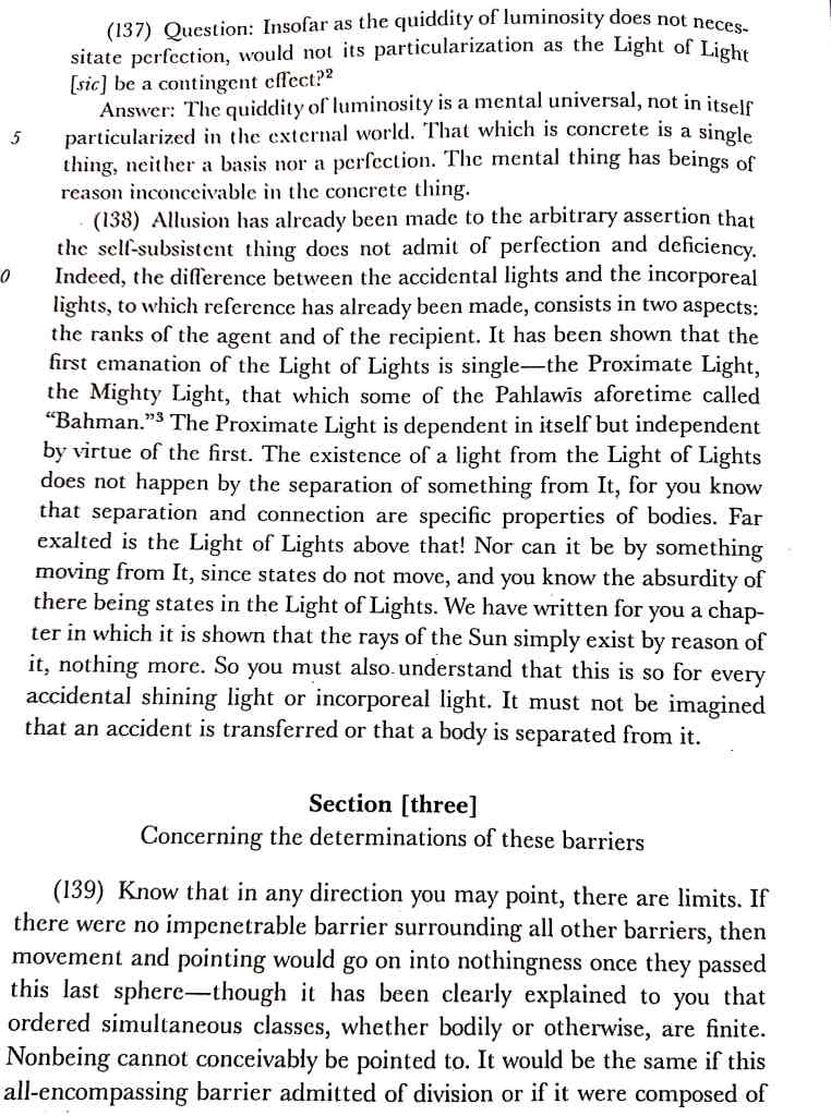 (138) Cahaya Terdekat bergantung pada dirinya sendiri dan mandiri berkat yang Awal. Eksistensi cahaya tidak terjadi dengan cara pemisahan dari Cahaya Maha Cahaya, seperti Anda tahu bahwa pemisahan dan penggabungan adalah sifat khusus dari bodi.
