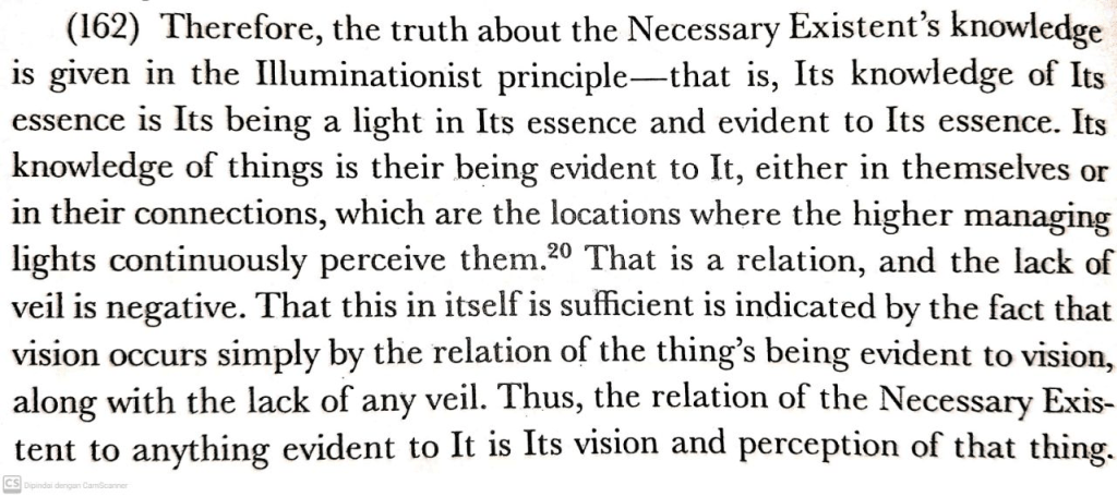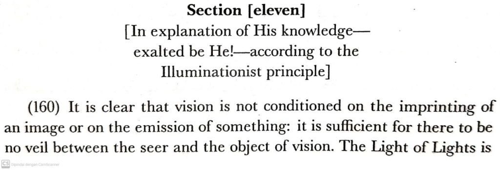 Tuhan mengetahui segala sesuatu, universal dan partikular, secara langsung sebagai huduri. Pengetahuan oleh Cahaya Maha Cahaya adalah hadirnya cahaya sejati dalam Cahaya Maha Cahaya.