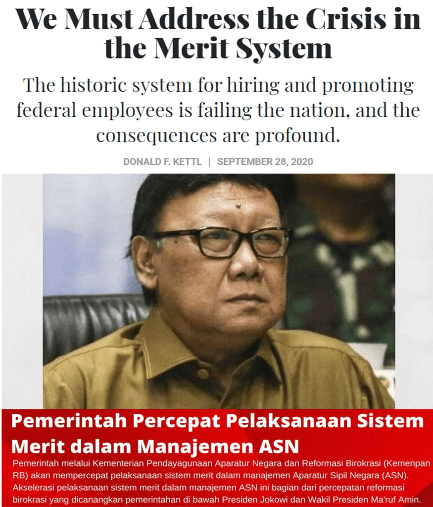 Dalam debat 2019, capres Jokowi hendak menerapkan sistem merit di Indonesia. Setelah terpilih, maka program sistem merit mulai digulirkan. Sementara di dunia internasional, sistem merit sedang menghadapi krisis besar. Bahkan, perkembangannya sebagai konsep meritokrasi, lebih luas lagi bahayanya.