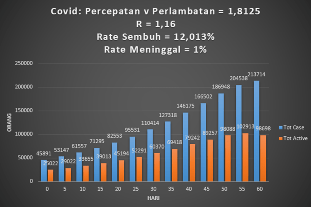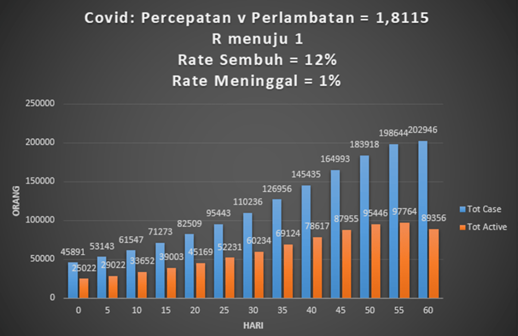 Bila ada yang sembuh atau meninggal maka jumlah aktif berkurang. Maka R turun ke bawah 1. Terbentuklah HI. Yaitu 6 juta orang aktif terinfeksi ini akan bertahan beberapa waktu. Atau jumlah mereka berkurang karena sembuh atau lainnya. Dan tidak ada perkembangan wabah. Pandemi berakhir.